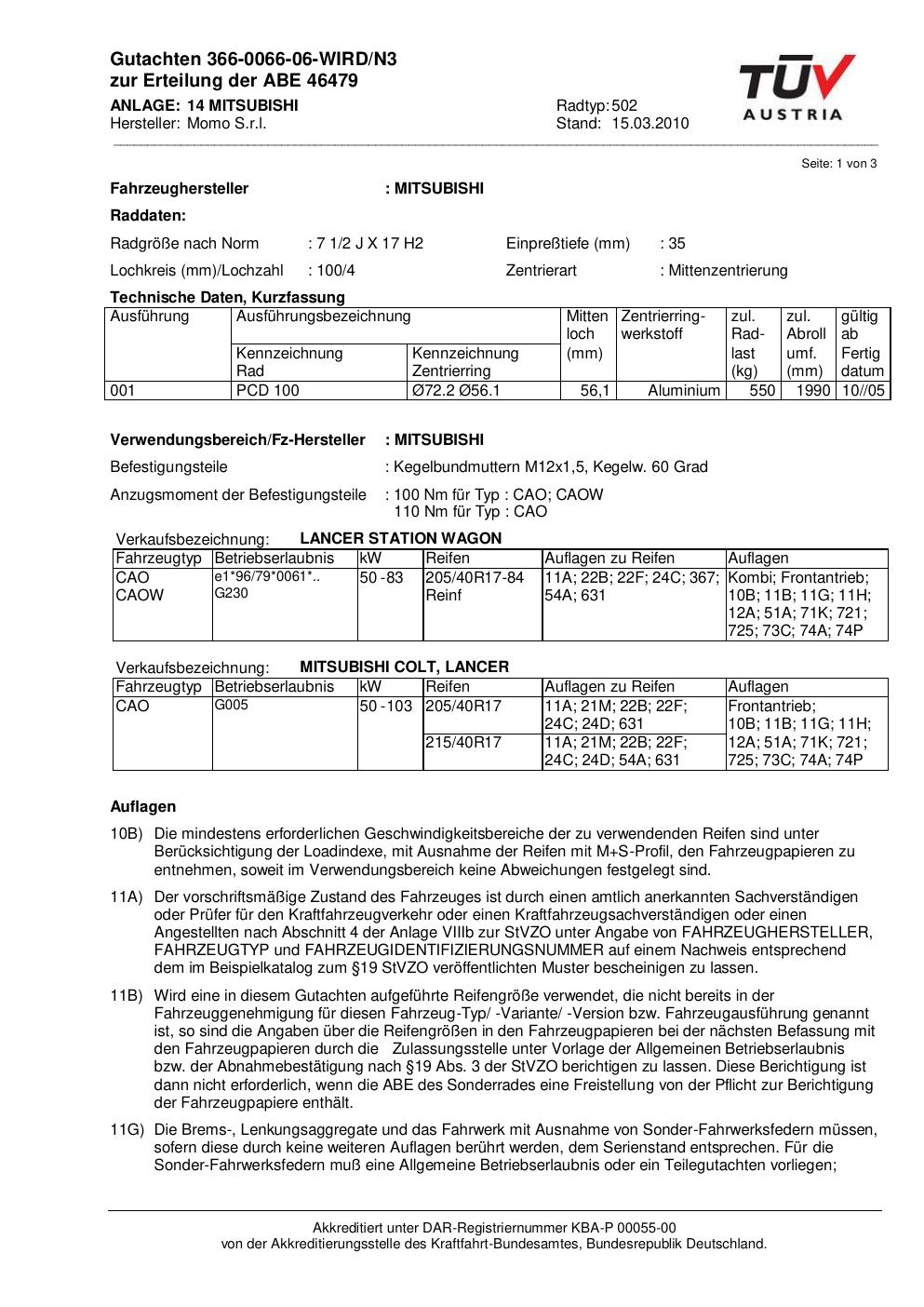 Dieses Gutachten (abe) bezieht sich auf die Alufelge brand-momo 502 in der Ausführung 2Jx17 ET 0, Mittenloch 0 mm (KBA 46479). Im PDF findest du typischerweise zulässige Reifengrößen, Auflagen/Anbauhinweise und – je nach Dokument – Hinweise zur Eintragung.