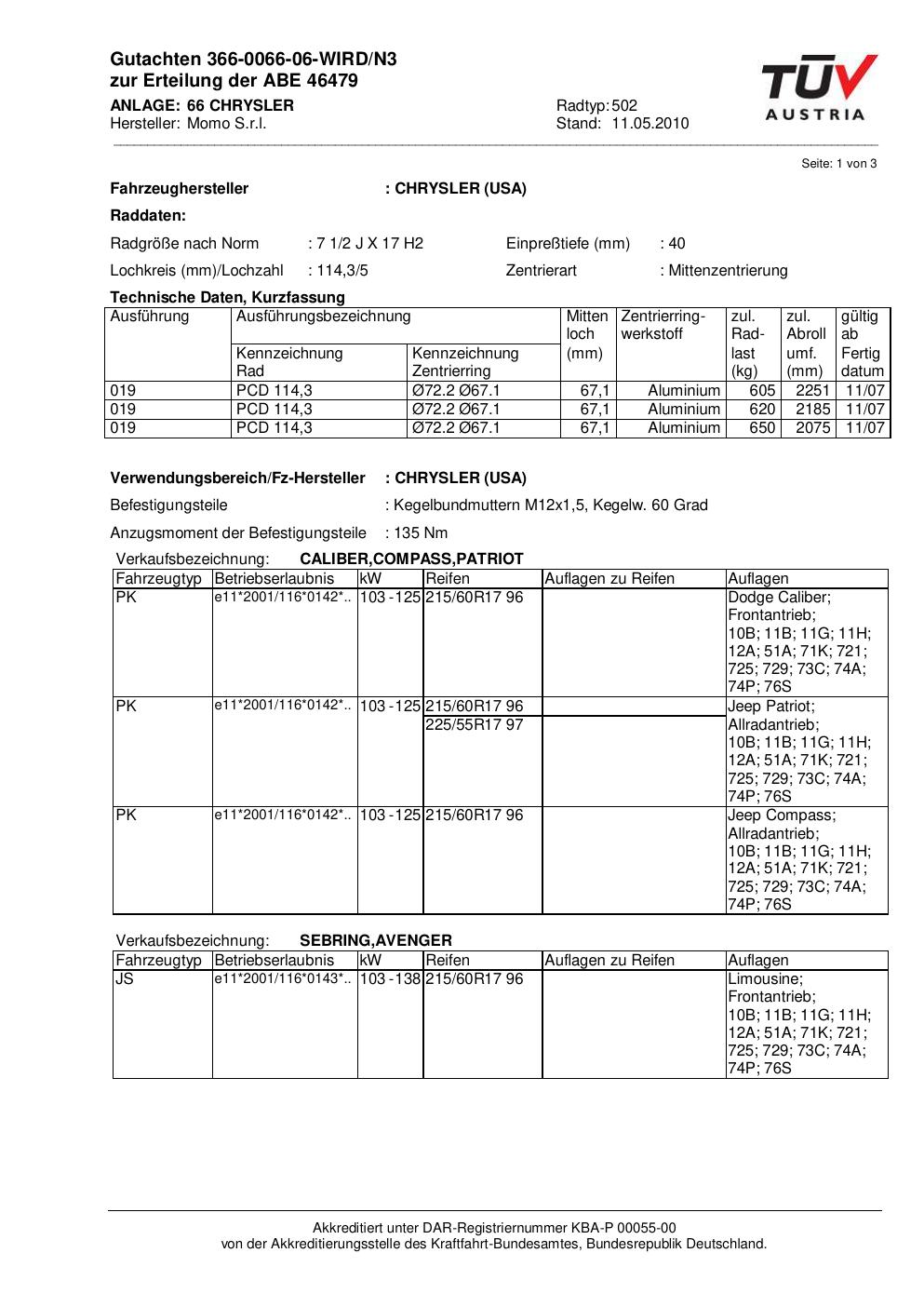 Dieses Gutachten (abe) bezieht sich auf die Alufelge brand-momo 502 in der Ausführung 2Jx17 ET 0, Mittenloch 0 mm (KBA 46479). Im PDF findest du typischerweise zulässige Reifengrößen, Auflagen/Anbauhinweise und – je nach Dokument – Hinweise zur Eintragung.
