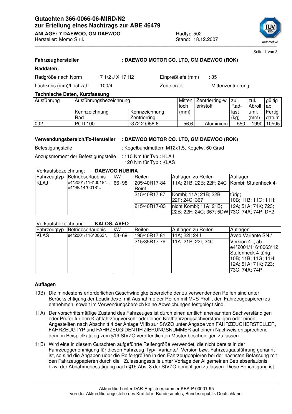 Dieses Gutachten (abe) bezieht sich auf die Alufelge brand-momo 502 in der Ausführung 2Jx17 ET 0, Mittenloch 0 mm (KBA 46479). Im PDF findest du typischerweise zulässige Reifengrößen, Auflagen/Anbauhinweise und – je nach Dokument – Hinweise zur Eintragung.