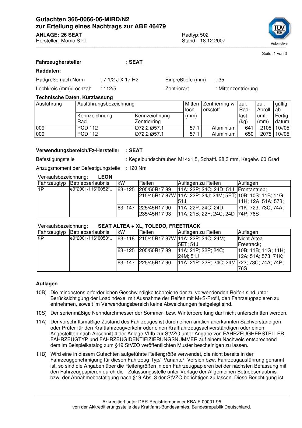 Dieses Gutachten (abe) bezieht sich auf die Alufelge brand-momo 502 in der Ausführung 2Jx17 ET 0, Mittenloch 0 mm (KBA 46479). Im PDF findest du typischerweise zulässige Reifengrößen, Auflagen/Anbauhinweise und – je nach Dokument – Hinweise zur Eintragung.