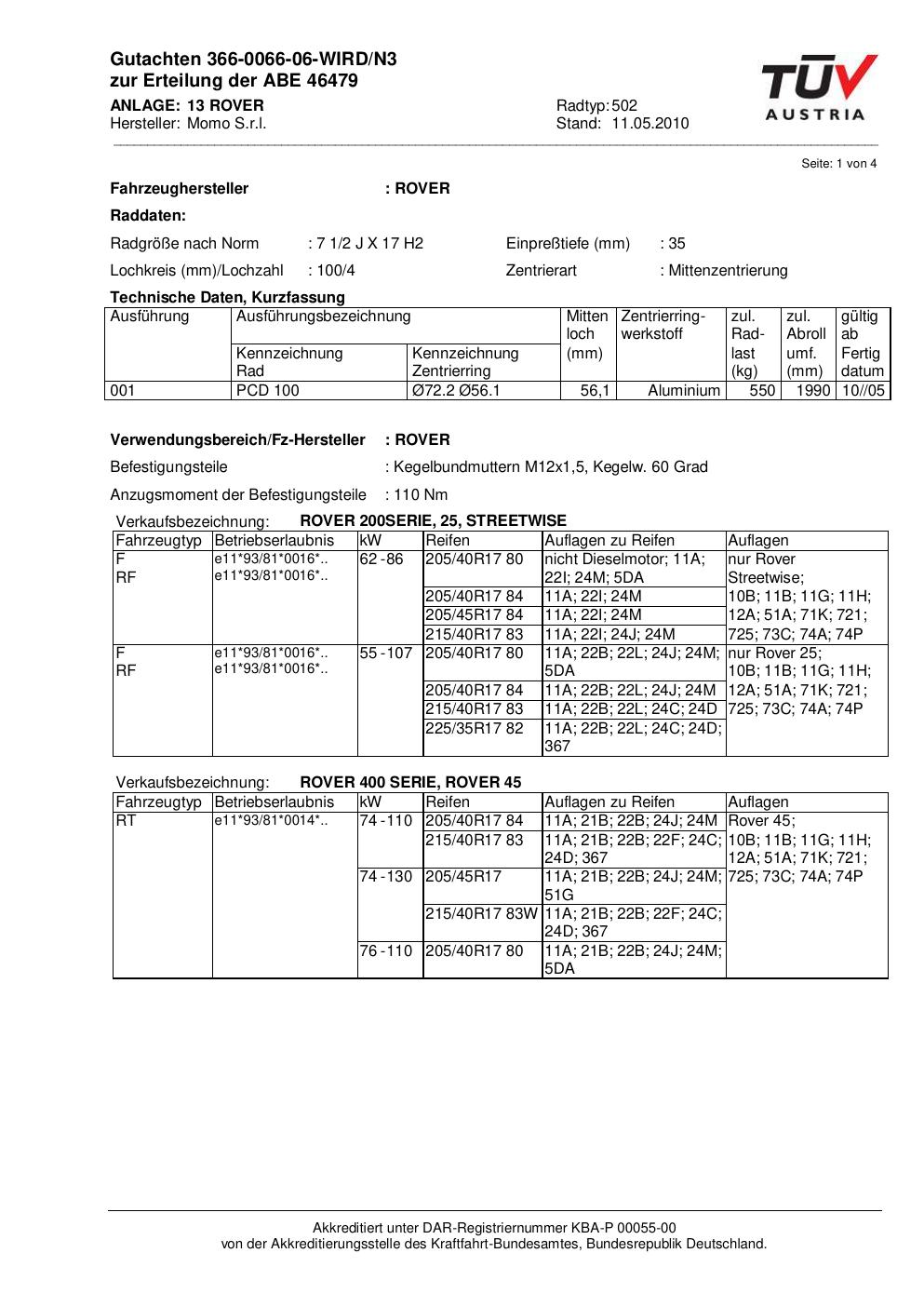 Dieses Gutachten (abe) bezieht sich auf die Alufelge brand-momo 502 in der Ausführung 2Jx17 ET 0, Mittenloch 0 mm (KBA 46479). Im PDF findest du typischerweise zulässige Reifengrößen, Auflagen/Anbauhinweise und – je nach Dokument – Hinweise zur Eintragung.