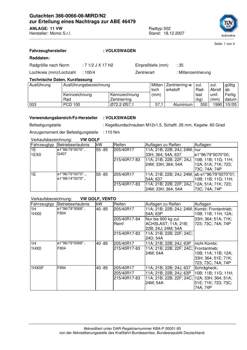Dieses Gutachten (abe) bezieht sich auf die Alufelge brand-momo 502 in der Ausführung 2Jx17 ET 0, Mittenloch 0 mm (KBA 46479). Im PDF findest du typischerweise zulässige Reifengrößen, Auflagen/Anbauhinweise und – je nach Dokument – Hinweise zur Eintragung.