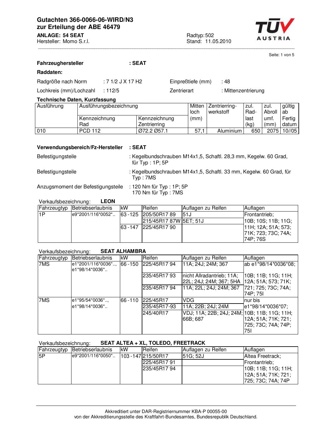 Dieses Gutachten (abe) bezieht sich auf die Alufelge brand-momo 502 in der Ausführung 2Jx17 ET 0, Mittenloch 0 mm (KBA 46479). Im PDF findest du typischerweise zulässige Reifengrößen, Auflagen/Anbauhinweise und – je nach Dokument – Hinweise zur Eintragung.