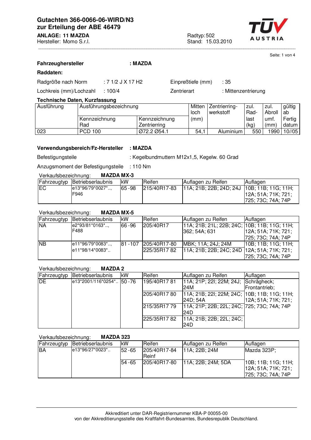 Dieses Gutachten (abe) bezieht sich auf die Alufelge brand-momo 502 in der Ausführung 2Jx17 ET 0, Mittenloch 0 mm (KBA 46479). Im PDF findest du typischerweise zulässige Reifengrößen, Auflagen/Anbauhinweise und – je nach Dokument – Hinweise zur Eintragung.