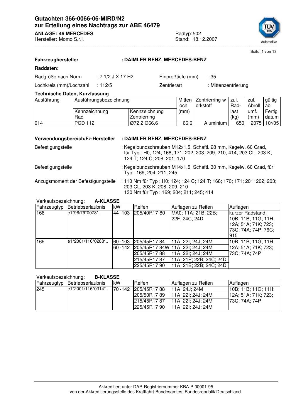 Dieses Gutachten (abe) bezieht sich auf die Alufelge brand-momo 502 in der Ausführung 2Jx17 ET 0, Mittenloch 0 mm (KBA 46479). Im PDF findest du typischerweise zulässige Reifengrößen, Auflagen/Anbauhinweise und – je nach Dokument – Hinweise zur Eintragung.