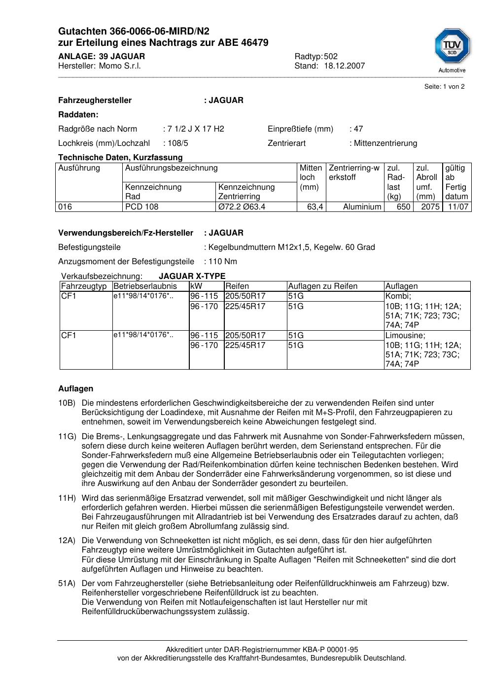 Dieses Gutachten (abe) bezieht sich auf die Alufelge brand-momo 502 in der Ausführung 2Jx17 ET 0, Mittenloch 0 mm (KBA 46479). Im PDF findest du typischerweise zulässige Reifengrößen, Auflagen/Anbauhinweise und – je nach Dokument – Hinweise zur Eintragung.