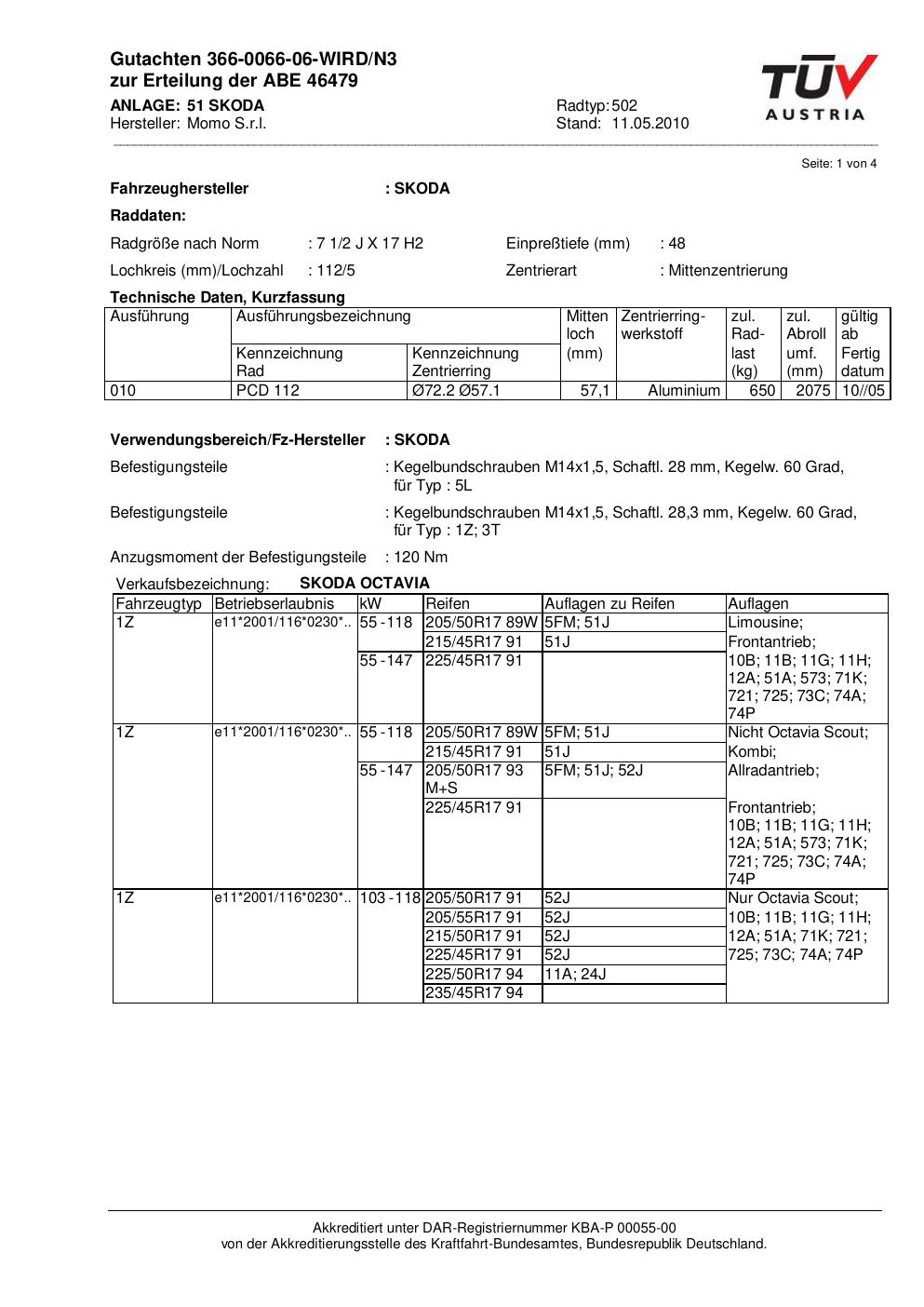 Dieses Gutachten (abe) bezieht sich auf die Alufelge brand-momo 502 in der Ausführung 2Jx17 ET 0, Mittenloch 0 mm (KBA 46479). Im PDF findest du typischerweise zulässige Reifengrößen, Auflagen/Anbauhinweise und – je nach Dokument – Hinweise zur Eintragung.