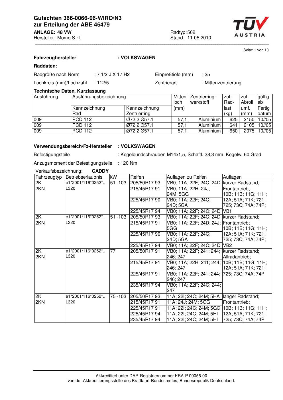 Dieses Gutachten (abe) bezieht sich auf die Alufelge brand-momo 502 in der Ausführung 2Jx17 ET 0, Mittenloch 0 mm (KBA 46479). Im PDF findest du typischerweise zulässige Reifengrößen, Auflagen/Anbauhinweise und – je nach Dokument – Hinweise zur Eintragung.