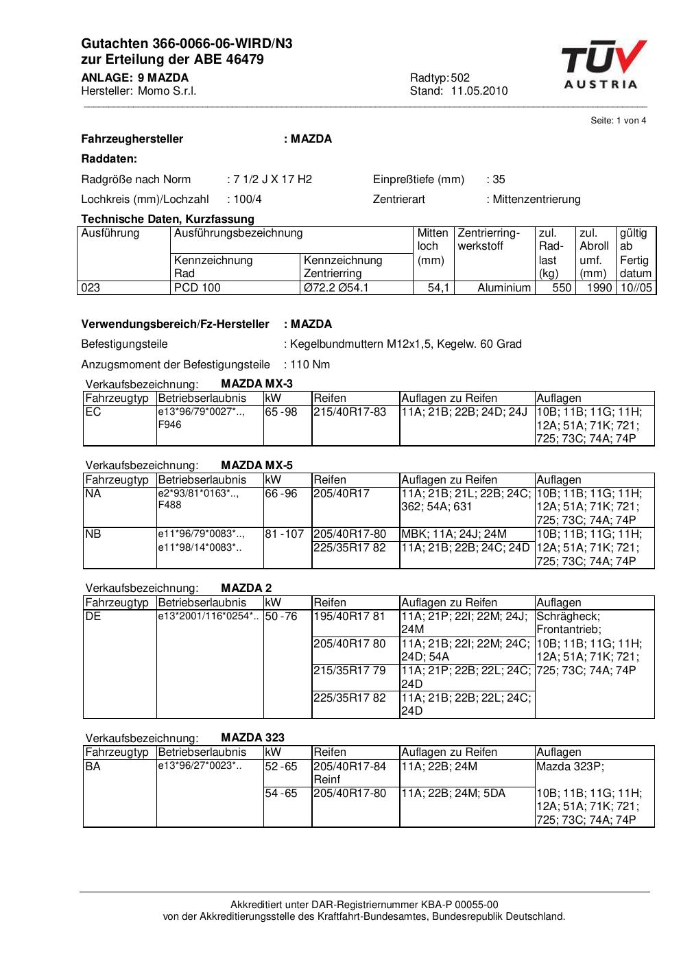 Dieses Gutachten (abe) bezieht sich auf die Alufelge brand-momo 502 in der Ausführung 2Jx17 ET 0, Mittenloch 0 mm (KBA 46479). Im PDF findest du typischerweise zulässige Reifengrößen, Auflagen/Anbauhinweise und – je nach Dokument – Hinweise zur Eintragung.