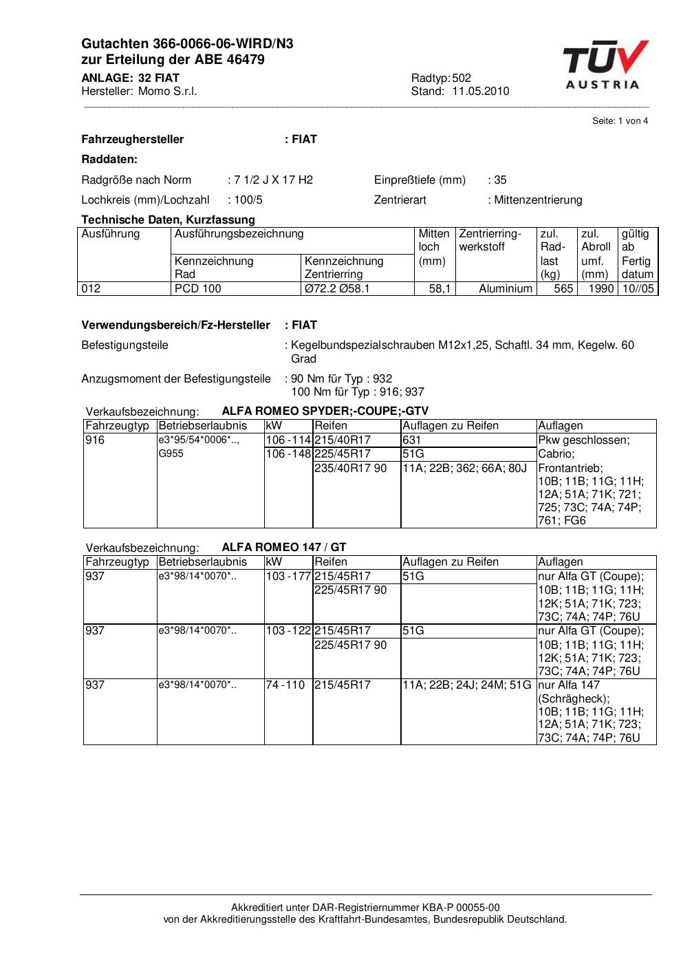 Dieses Gutachten (abe) bezieht sich auf die Alufelge brand-momo 502 in der Ausführung 2Jx17 ET 0, Mittenloch 0 mm (KBA 46479). Im PDF findest du typischerweise zulässige Reifengrößen, Auflagen/Anbauhinweise und – je nach Dokument – Hinweise zur Eintragung.