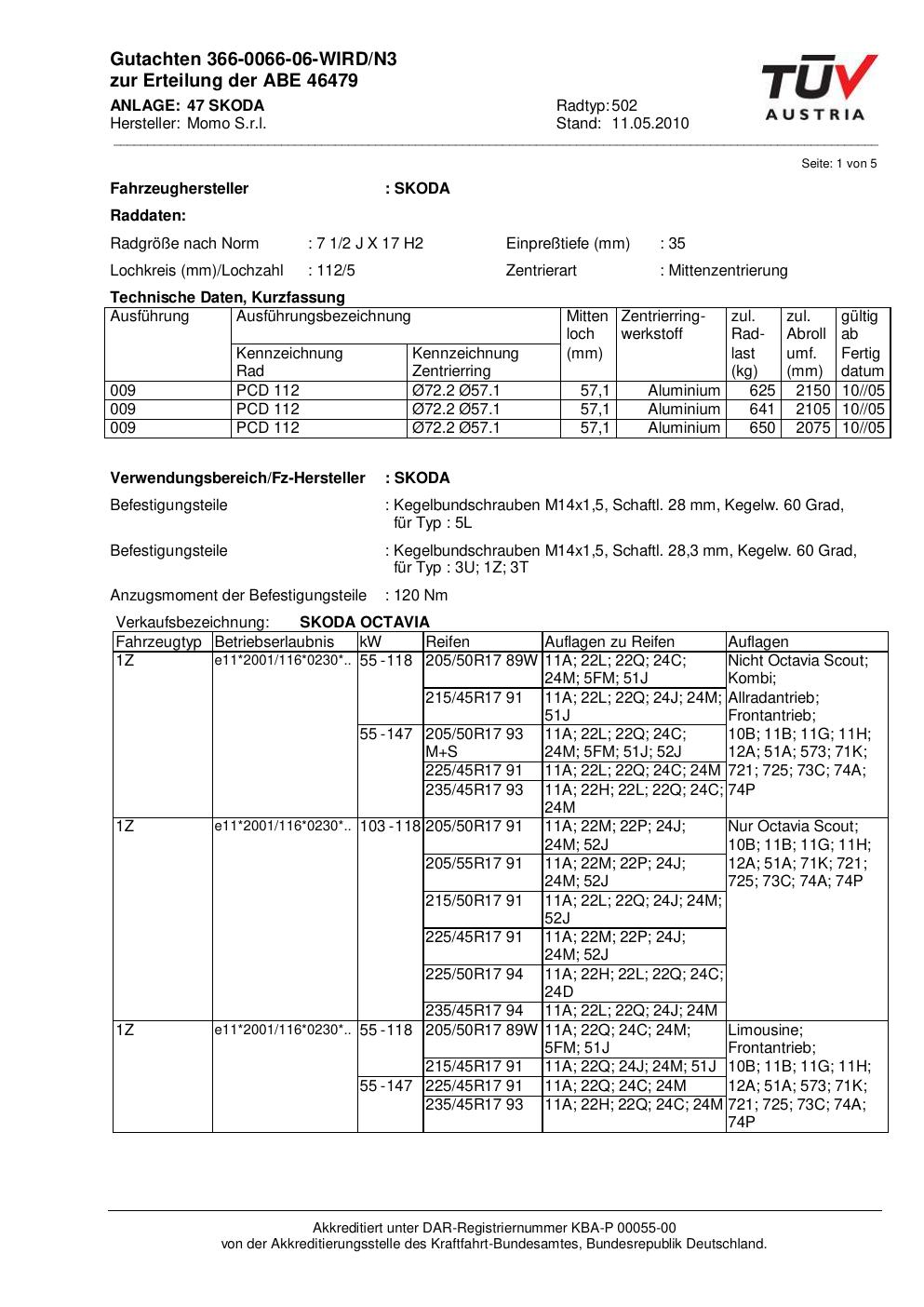 Dieses Gutachten (abe) bezieht sich auf die Alufelge brand-momo 502 in der Ausführung 2Jx17 ET 0, Mittenloch 0 mm (KBA 46479). Im PDF findest du typischerweise zulässige Reifengrößen, Auflagen/Anbauhinweise und – je nach Dokument – Hinweise zur Eintragung.