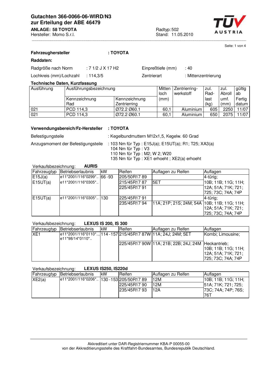 Dieses Gutachten (abe) bezieht sich auf die Alufelge brand-momo 502 in der Ausführung 2Jx17 ET 0, Mittenloch 0 mm (KBA 46479). Im PDF findest du typischerweise zulässige Reifengrößen, Auflagen/Anbauhinweise und – je nach Dokument – Hinweise zur Eintragung.