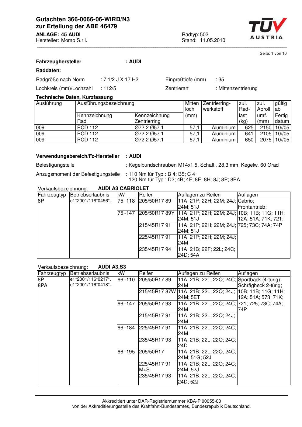 Dieses Gutachten (abe) bezieht sich auf die Alufelge brand-momo 502 in der Ausführung 2Jx17 ET 0, Mittenloch 0 mm (KBA 46479). Im PDF findest du typischerweise zulässige Reifengrößen, Auflagen/Anbauhinweise und – je nach Dokument – Hinweise zur Eintragung.
