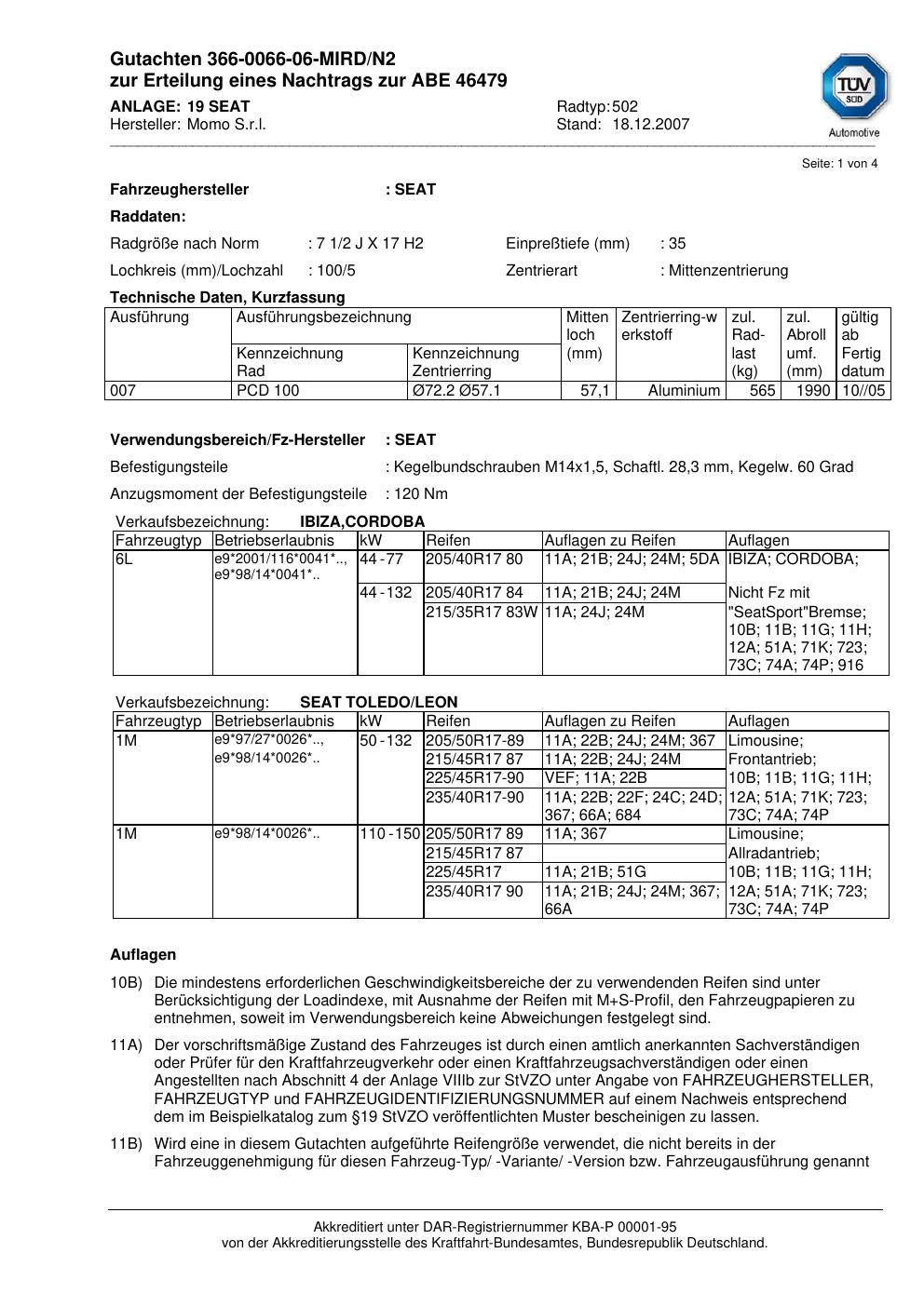 Dieses Gutachten (abe) bezieht sich auf die Alufelge brand-momo 502 in der Ausführung 2Jx17 ET 0, Mittenloch 0 mm (KBA 46479). Im PDF findest du typischerweise zulässige Reifengrößen, Auflagen/Anbauhinweise und – je nach Dokument – Hinweise zur Eintragung.