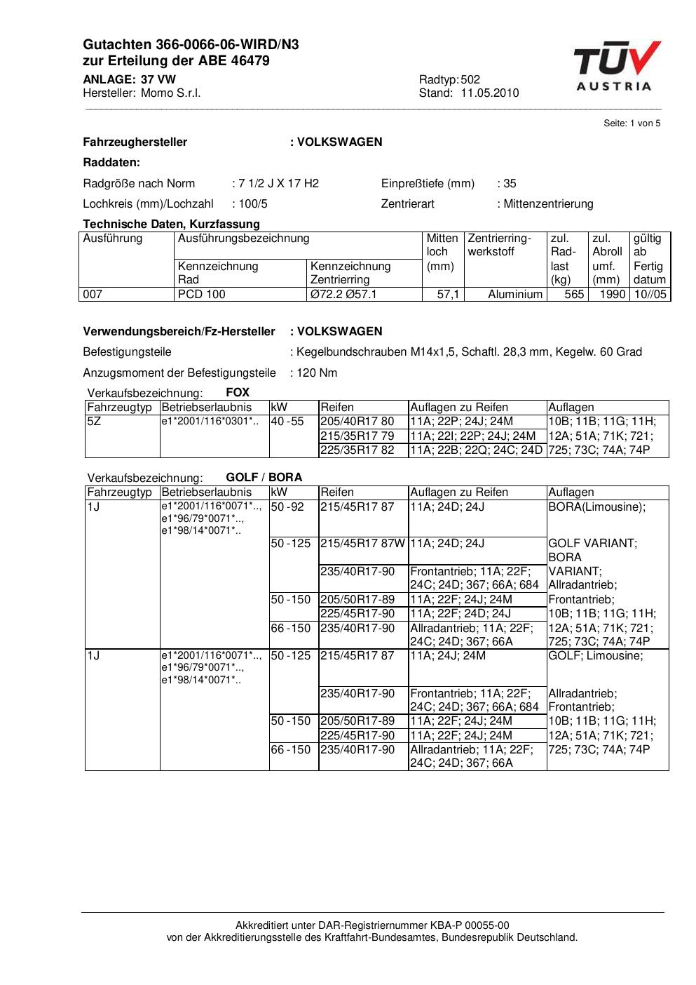 Dieses Gutachten (abe) bezieht sich auf die Alufelge brand-momo 502 in der Ausführung 2Jx17 ET 0, Mittenloch 0 mm (KBA 46479). Im PDF findest du typischerweise zulässige Reifengrößen, Auflagen/Anbauhinweise und – je nach Dokument – Hinweise zur Eintragung.