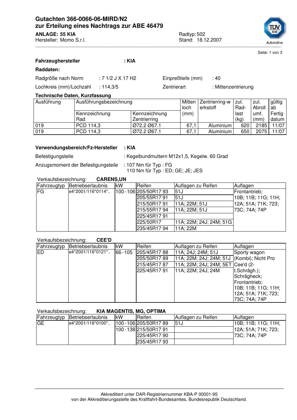 Dieses Gutachten (abe) bezieht sich auf die Alufelge brand-momo 502 in der Ausführung 2Jx17 ET 0, Mittenloch 0 mm (KBA 46479). Im PDF findest du typischerweise zulässige Reifengrößen, Auflagen/Anbauhinweise und – je nach Dokument – Hinweise zur Eintragung.