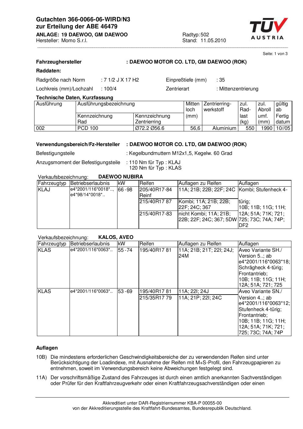 Dieses Gutachten (abe) bezieht sich auf die Alufelge brand-momo 502 in der Ausführung 2Jx17 ET 0, Mittenloch 0 mm (KBA 46479). Im PDF findest du typischerweise zulässige Reifengrößen, Auflagen/Anbauhinweise und – je nach Dokument – Hinweise zur Eintragung.