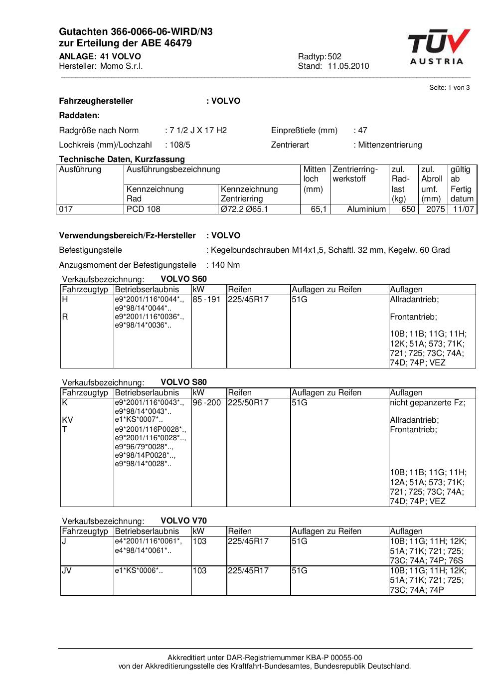Dieses Gutachten (abe) bezieht sich auf die Alufelge brand-momo 502 in der Ausführung 2Jx17 ET 0, Mittenloch 0 mm (KBA 46479). Im PDF findest du typischerweise zulässige Reifengrößen, Auflagen/Anbauhinweise und – je nach Dokument – Hinweise zur Eintragung.