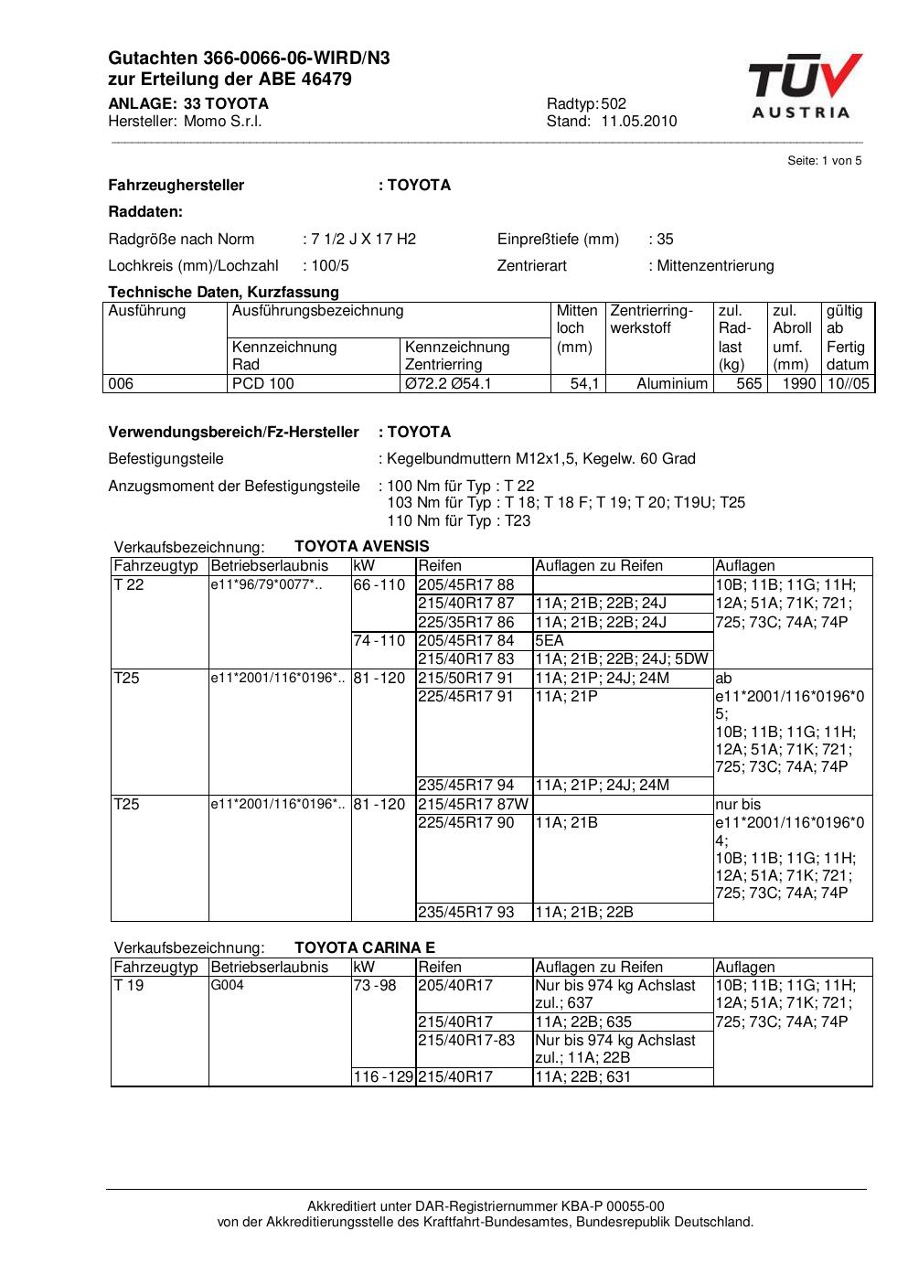 Dieses Gutachten (abe) bezieht sich auf die Alufelge brand-momo 502 in der Ausführung 2Jx17 ET 0, Mittenloch 0 mm (KBA 46479). Im PDF findest du typischerweise zulässige Reifengrößen, Auflagen/Anbauhinweise und – je nach Dokument – Hinweise zur Eintragung.