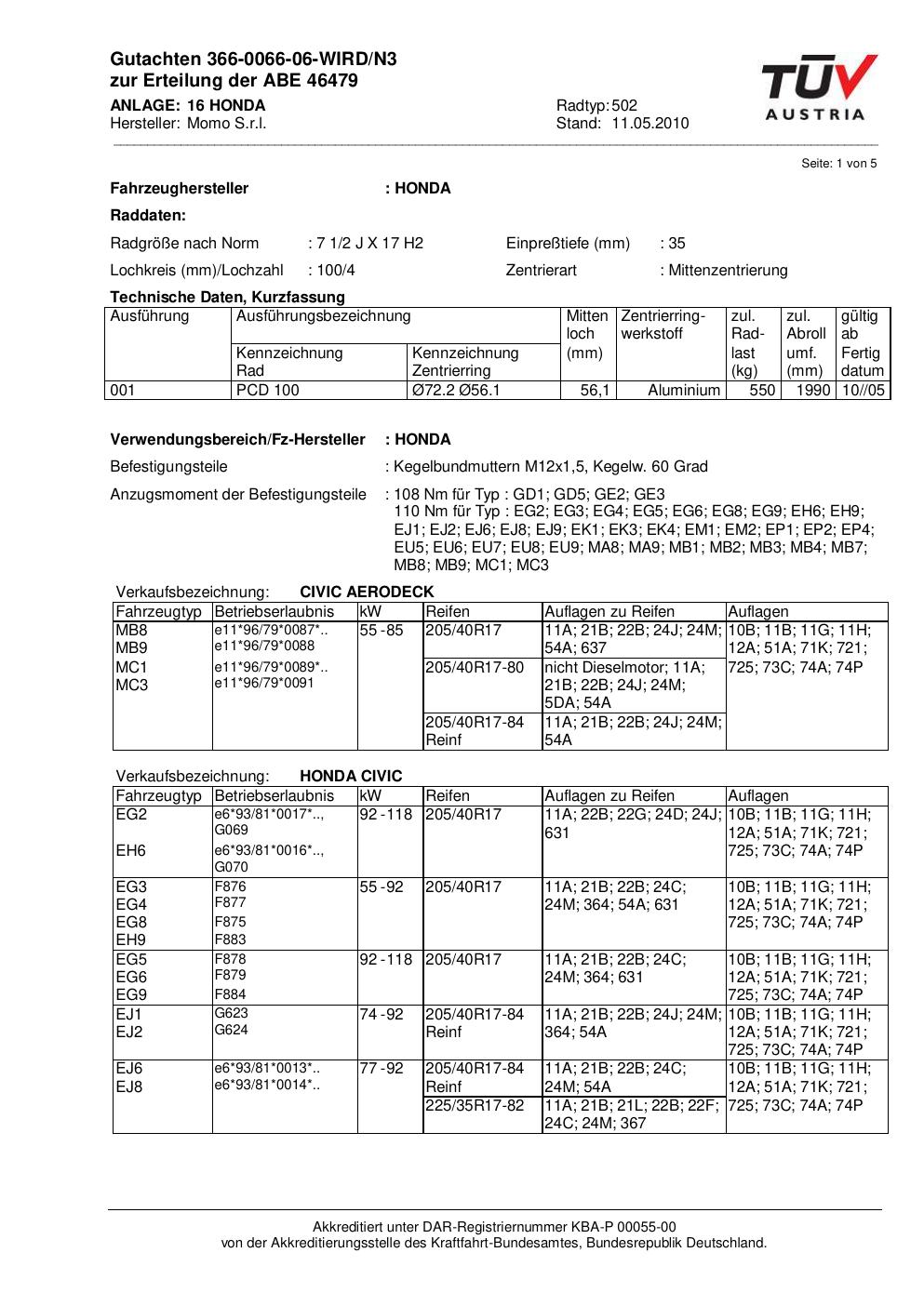 Dieses Gutachten (abe) bezieht sich auf die Alufelge brand-momo 502 in der Ausführung 2Jx17 ET 0, Mittenloch 0 mm (KBA 46479). Im PDF findest du typischerweise zulässige Reifengrößen, Auflagen/Anbauhinweise und – je nach Dokument – Hinweise zur Eintragung.