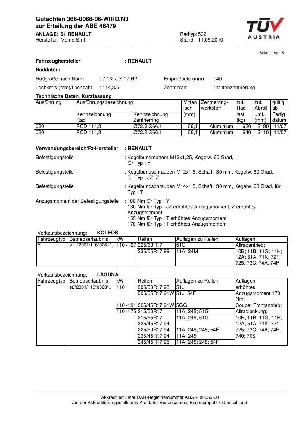 Dieses Gutachten (abe) bezieht sich auf die Alufelge brand-momo 502 in der Ausführung 2Jx17 ET 0, Mittenloch 0 mm (KBA 46479). Im PDF findest du typischerweise zulässige Reifengrößen, Auflagen/Anbauhinweise und – je nach Dokument – Hinweise zur Eintragung.