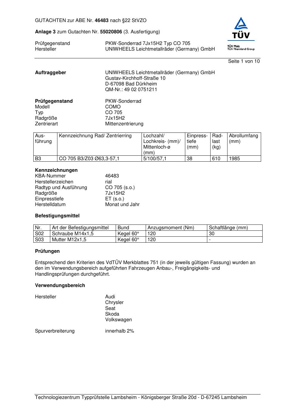 Dieses Gutachten (abe) bezieht sich auf die Alufelge brand-rial CO 705 in der Ausführung 7Jx15 ET 0, Mittenloch 0 mm (KBA 46483). Im PDF findest du typischerweise zulässige Reifengrößen, Auflagen/Anbauhinweise und – je nach Dokument – Hinweise zur Eintragung.