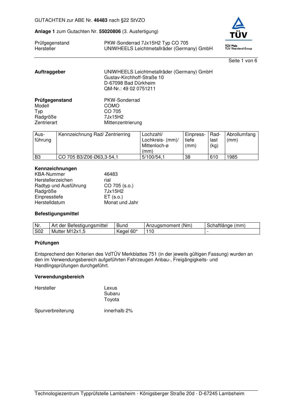 Dieses Gutachten (abe) bezieht sich auf die Alufelge brand-rial CO 705 in der Ausführung 7Jx15 ET 0, Mittenloch 0 mm (KBA 46483). Im PDF findest du typischerweise zulässige Reifengrößen, Auflagen/Anbauhinweise und – je nach Dokument – Hinweise zur Eintragung.