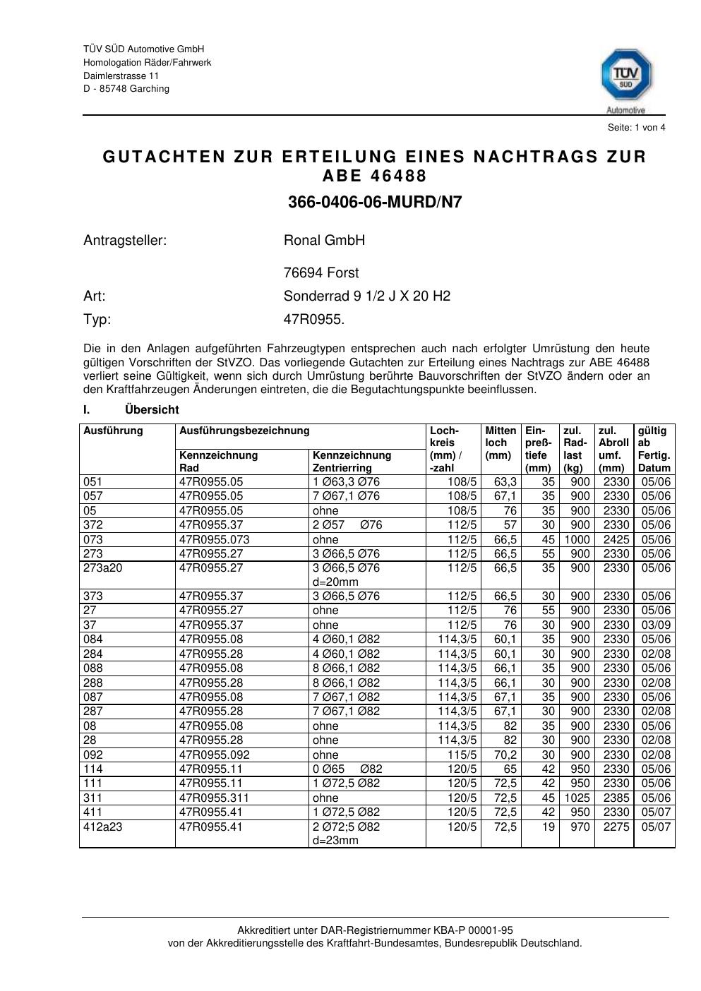 Dieses Gutachten (abe) bezieht sich auf die Alufelge Ronal 47R0955 in der Ausführung 2Jx2 ET 0, Mittenloch 0 mm (KBA 46488). Im PDF findest du typischerweise zulässige Reifengrößen, Auflagen/Anbauhinweise und – je nach Dokument – Hinweise zur Eintragung.