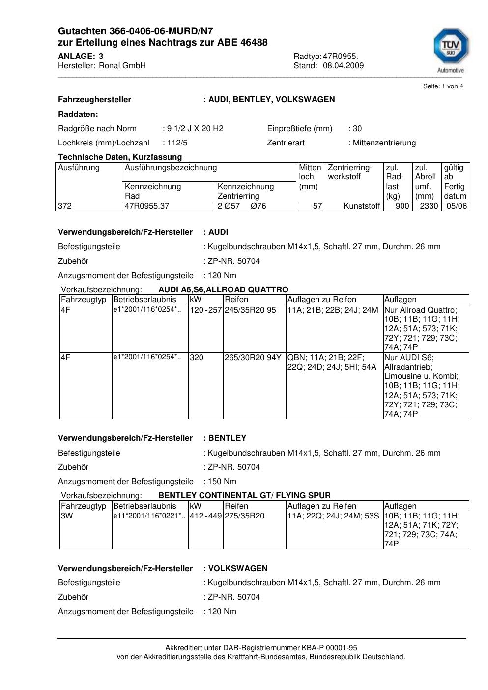 Dieses Gutachten (abe) bezieht sich auf die Alufelge Ronal 47R0955 in der Ausführung 2Jx2 ET 0, Mittenloch 0 mm (KBA 46488). Im PDF findest du typischerweise zulässige Reifengrößen, Auflagen/Anbauhinweise und – je nach Dokument – Hinweise zur Eintragung.