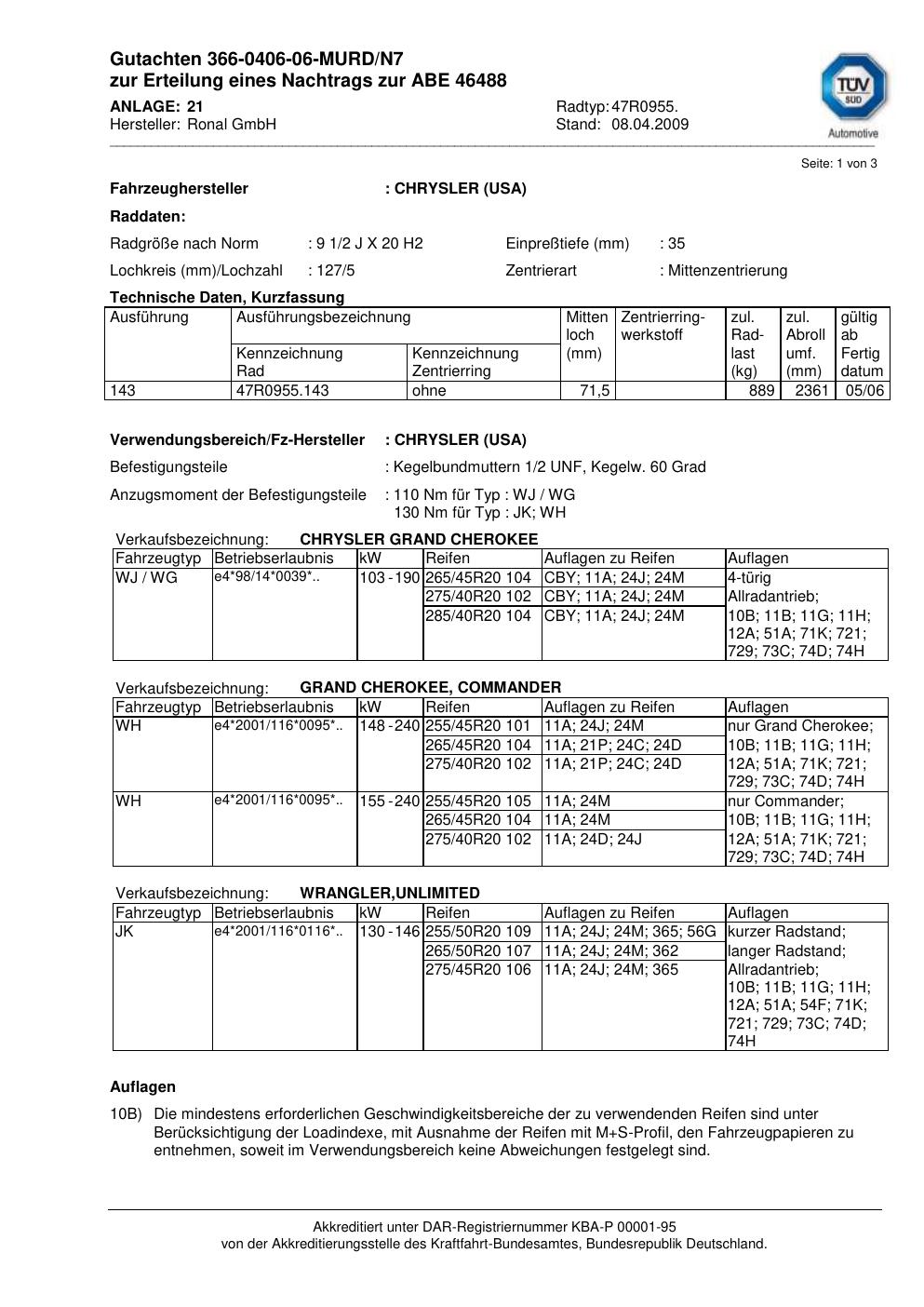 Dieses Gutachten (abe) bezieht sich auf die Alufelge Ronal 47R0955 in der Ausführung 2Jx2 ET 0, Mittenloch 0 mm (KBA 46488). Im PDF findest du typischerweise zulässige Reifengrößen, Auflagen/Anbauhinweise und – je nach Dokument – Hinweise zur Eintragung.