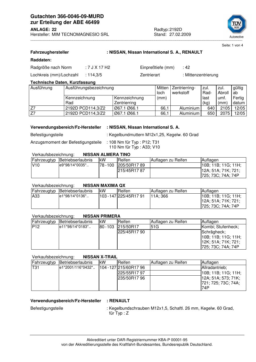 Felgengutachten / abe für Alufelgen ATS 2192D (7Jx17 ET 0, Mittenloch 0 mm) mit KBA 46499 (Zertifikatsnummer 46499). Hier kostenlos als PDF herunterladen. Der Download-Link ist 24 Stunden gültig und kann bis zu zwei Mal verwendet werden.