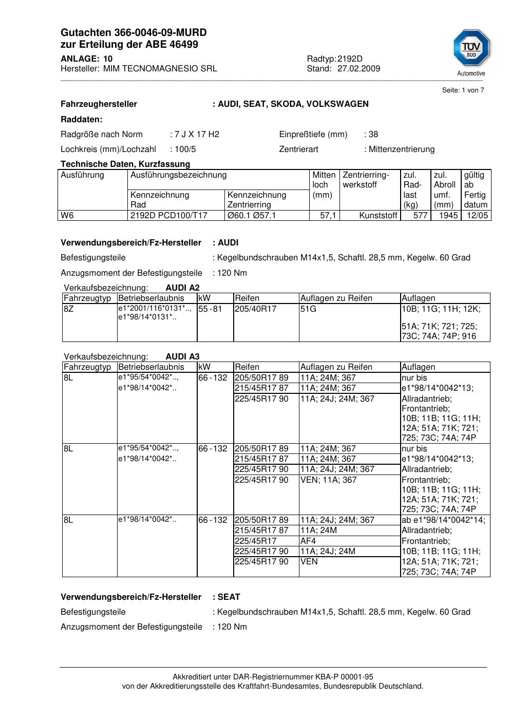 Felgengutachten / abe für Alufelgen ATS 2192D (7Jx17 ET 0, Mittenloch 0 mm) mit KBA 46499 (Zertifikatsnummer 46499). Hier kostenlos als PDF herunterladen. Der Download-Link ist 24 Stunden gültig und kann bis zu zwei Mal verwendet werden.