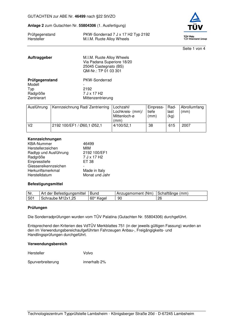 Dieses Gutachten (abe) bezieht sich auf die Alufelge Superior 2192 in der Ausführung 7Jx17 ET 0, Mittenloch 0 mm (KBA 46499). Im PDF findest du typischerweise zulässige Reifengrößen, Auflagen/Anbauhinweise und – je nach Dokument – Hinweise zur Eintragung.
