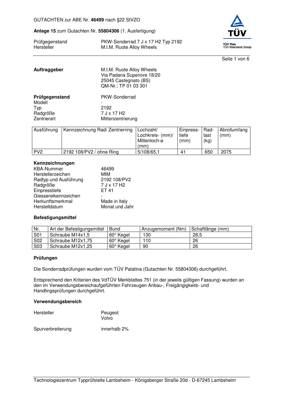 Dieses Gutachten (abe) bezieht sich auf die Alufelge Superior 2192 in der Ausführung 7Jx17 ET 0, Mittenloch 0 mm (KBA 46499). Im PDF findest du typischerweise zulässige Reifengrößen, Auflagen/Anbauhinweise und – je nach Dokument – Hinweise zur Eintragung.