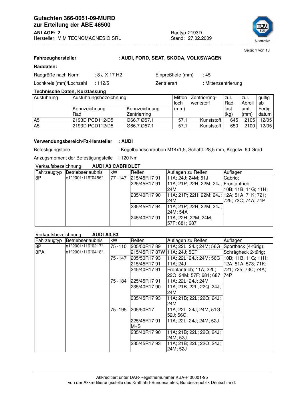 Dieses abe führt 6 Fahrzeugvarianten von 6 Fahrzeugherstellern als zulässig auf. Abgedeckt werden insbesondere Fahrzeuge von AUDI, FORD, SEAT, SKODA, VOLKSWAGEN, VW. Prüfe in der folgenden Liste, ob dein konkretes Fahrzeugmodell und – soweit angegeben – der passende Typ-Code (HSN/TSN-Variante) dabei ist. Der Typ-Code steht im Fahrzeugschein unter den Ziffern 2.1 und 2.2 – eine Schritt-für-Schritt-Anleitung dazu findest du im Wiki-Artikel zum Selbst-Prüfen des Gutachtens.