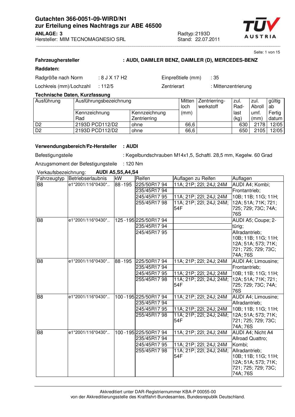 Dieses abe führt 3 Fahrzeugvarianten von 3 Fahrzeugherstellern als zulässig auf. Abgedeckt werden insbesondere Fahrzeuge von AUDI, DAIMLER, MERCEDES-BENZ. Prüfe in der folgenden Liste, ob dein konkretes Fahrzeugmodell und – soweit angegeben – der passende Typ-Code (HSN/TSN-Variante) dabei ist. Der Typ-Code steht im Fahrzeugschein unter den Ziffern 2.1 und 2.2 – eine Schritt-für-Schritt-Anleitung dazu findest du im Wiki-Artikel zum Selbst-Prüfen des Gutachtens.