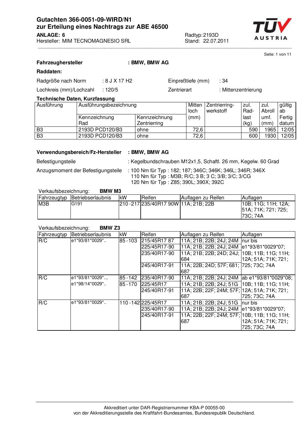 Dieses abe führt 1 Fahrzeugvariante von 1 Fahrzeughersteller als zulässig auf. Abgedeckt werden insbesondere Fahrzeuge von BMW. Prüfe in der folgenden Liste, ob dein konkretes Fahrzeugmodell und – soweit angegeben – der passende Typ-Code (HSN/TSN-Variante) dabei ist. Der Typ-Code steht im Fahrzeugschein unter den Ziffern 2.1 und 2.2 – eine Schritt-für-Schritt-Anleitung dazu findest du im Wiki-Artikel zum Selbst-Prüfen des Gutachtens.