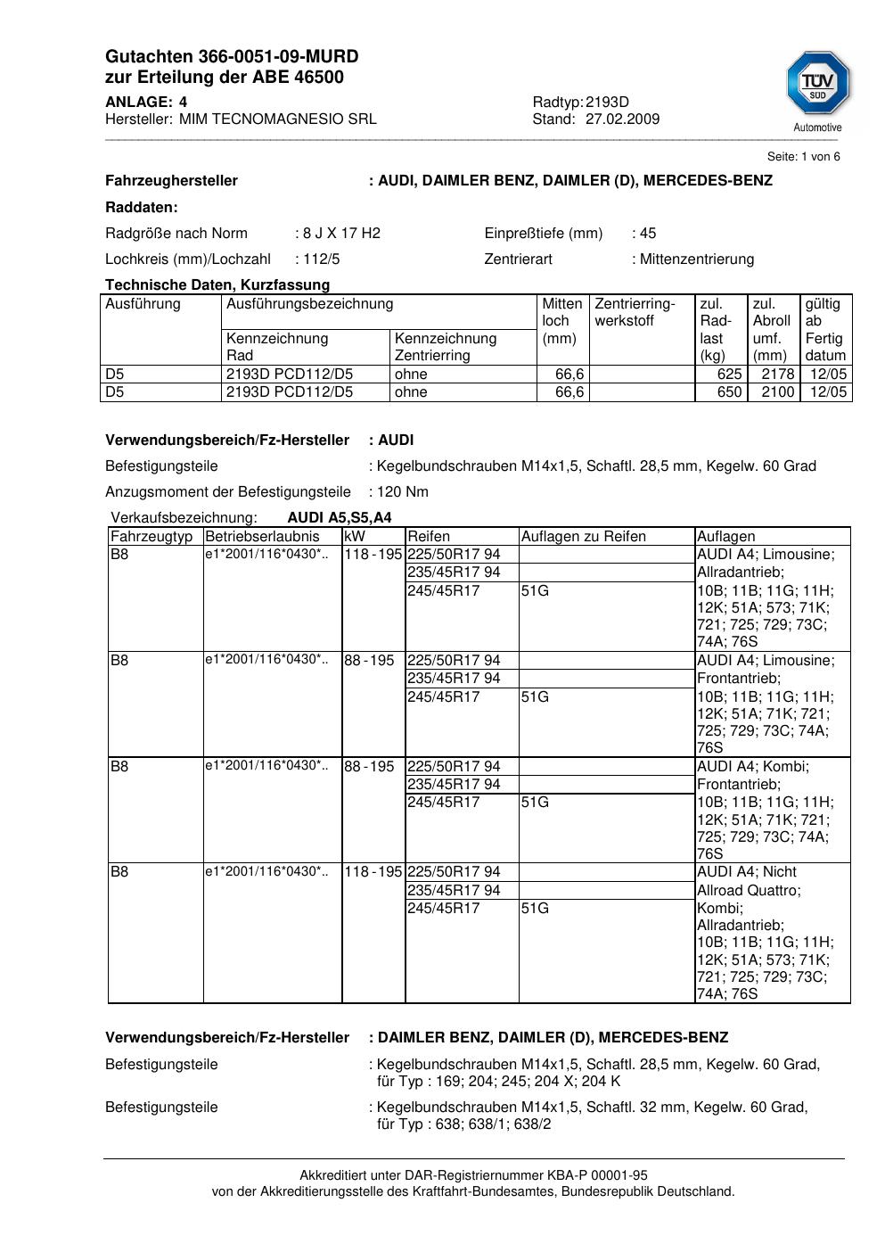 Dieses abe führt 3 Fahrzeugvarianten von 3 Fahrzeugherstellern als zulässig auf. Abgedeckt werden insbesondere Fahrzeuge von AUDI, DAIMLER, MERCEDES-BENZ. Prüfe in der folgenden Liste, ob dein konkretes Fahrzeugmodell und – soweit angegeben – der passende Typ-Code (HSN/TSN-Variante) dabei ist. Der Typ-Code steht im Fahrzeugschein unter den Ziffern 2.1 und 2.2 – eine Schritt-für-Schritt-Anleitung dazu findest du im Wiki-Artikel zum Selbst-Prüfen des Gutachtens.