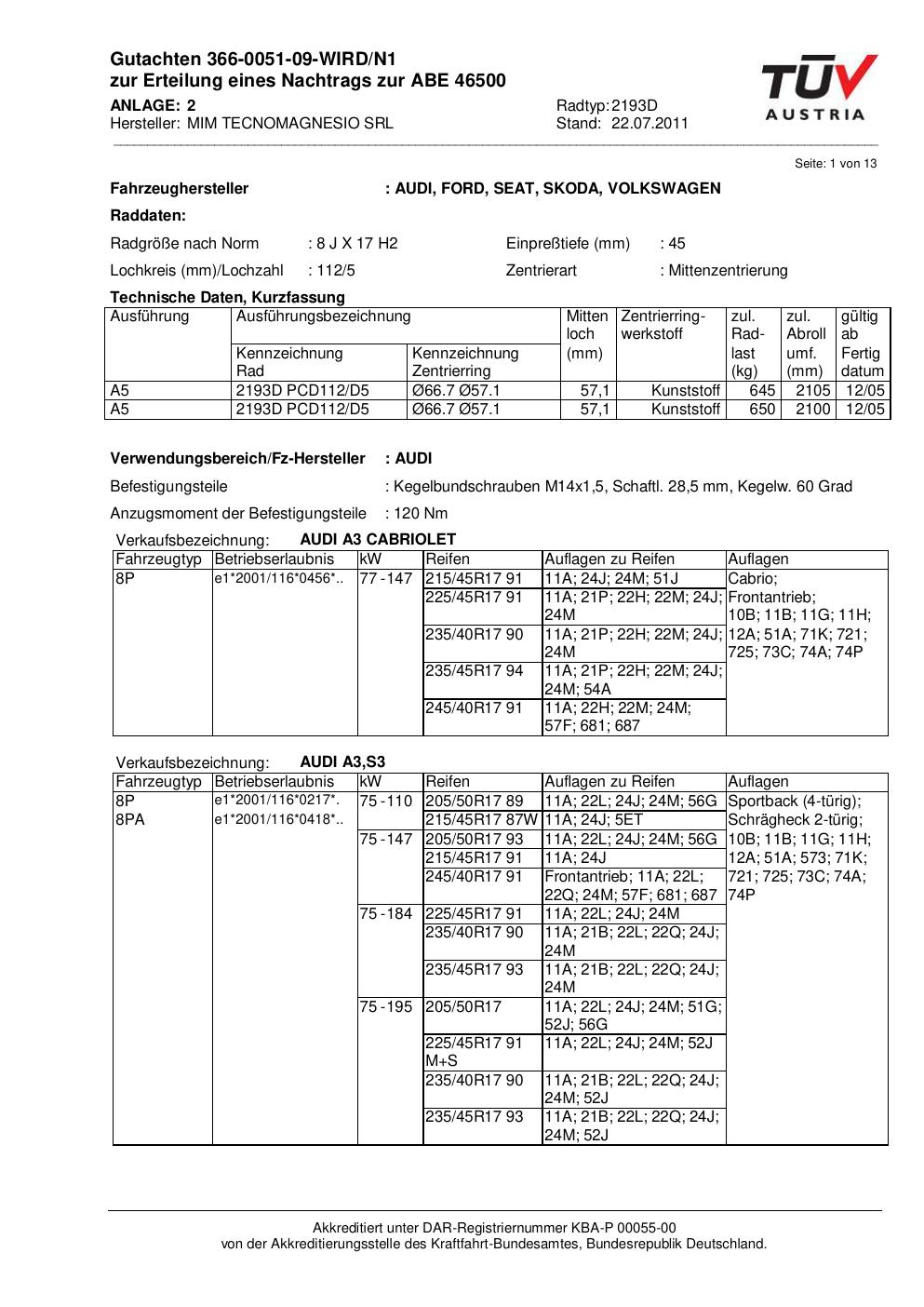 Fahrzeugfreigaben: AUDI, QUATTRO, SEAT, SKODA