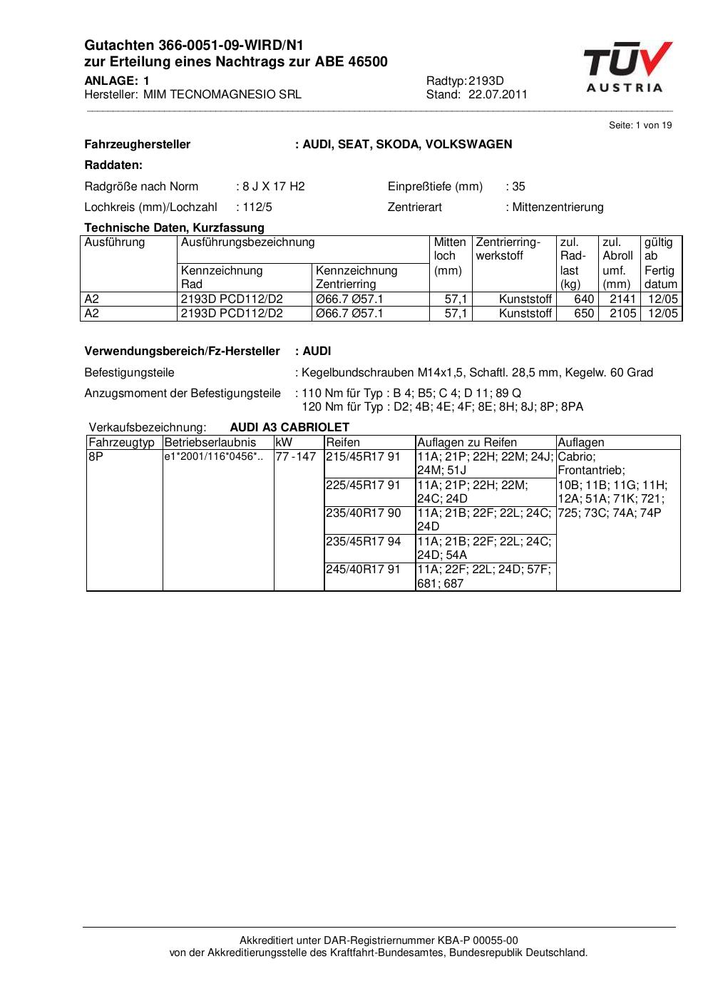 Fahrzeugfreigaben: AUDI, QUATTRO, SEAT, SKODA