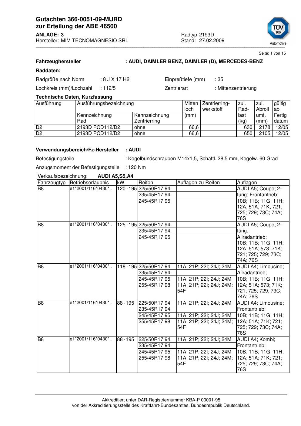 Dieses abe führt 3 Fahrzeugvarianten von 3 Fahrzeugherstellern als zulässig auf. Abgedeckt werden insbesondere Fahrzeuge von AUDI, DAIMLER, MERCEDES-BENZ. Prüfe in der folgenden Liste, ob dein konkretes Fahrzeugmodell und – soweit angegeben – der passende Typ-Code (HSN/TSN-Variante) dabei ist. Der Typ-Code steht im Fahrzeugschein unter den Ziffern 2.1 und 2.2 – eine Schritt-für-Schritt-Anleitung dazu findest du im Wiki-Artikel zum Selbst-Prüfen des Gutachtens.