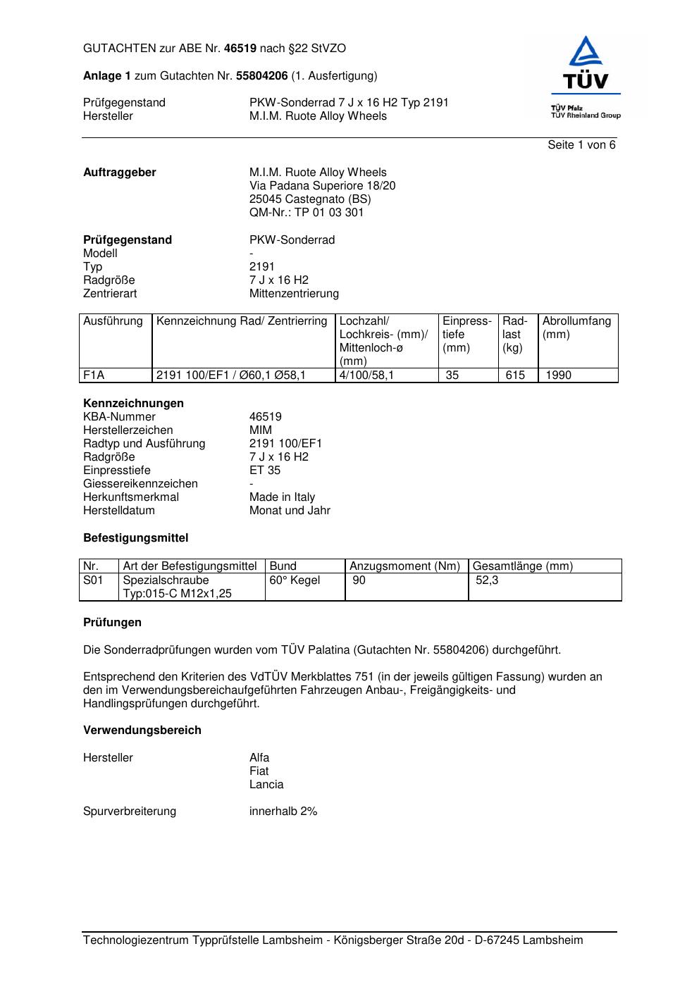 Felgengutachten / abe für Alufelgen Superior 2191 (7Jx16 ET 0, Mittenloch 0 mm) mit KBA 46519 (Zertifikatsnummer 46519). Hier kostenlos als PDF herunterladen. Der Download-Link ist 24 Stunden gültig und kann bis zu zwei Mal verwendet werden.