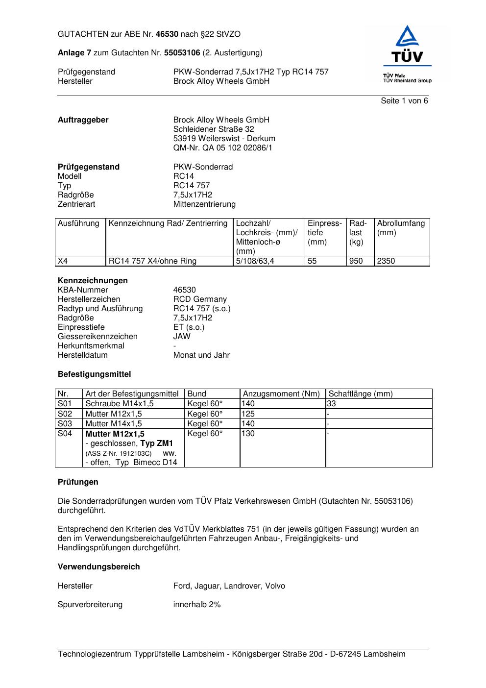 Dieses Gutachten (abe) bezieht sich auf die Alufelge Brock RC14 757 in der Ausführung 7.5Jx17 ET 0, Mittenloch 0 mm (KBA 46530). Im PDF findest du typischerweise zulässige Reifengrößen, Auflagen/Anbauhinweise und – je nach Dokument – Hinweise zur Eintragung.