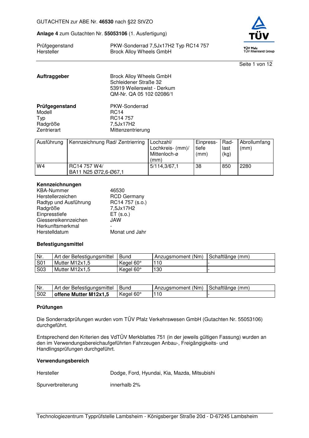 Dieses Gutachten (abe) bezieht sich auf die Alufelge Brock RC14 757 in der Ausführung 7.5Jx17 ET 0, Mittenloch 0 mm (KBA 46530). Im PDF findest du typischerweise zulässige Reifengrößen, Auflagen/Anbauhinweise und – je nach Dokument – Hinweise zur Eintragung.