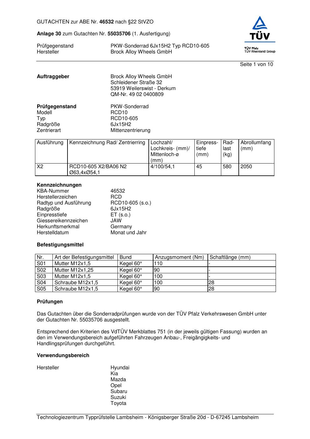 Dieses Gutachten (abe) bezieht sich auf die Alufelge Brock RCD10-605 in der Ausführung 6Jx15 ET 0, Mittenloch 0 mm (KBA 46532). Im PDF findest du typischerweise zulässige Reifengrößen, Auflagen/Anbauhinweise und – je nach Dokument – Hinweise zur Eintragung.