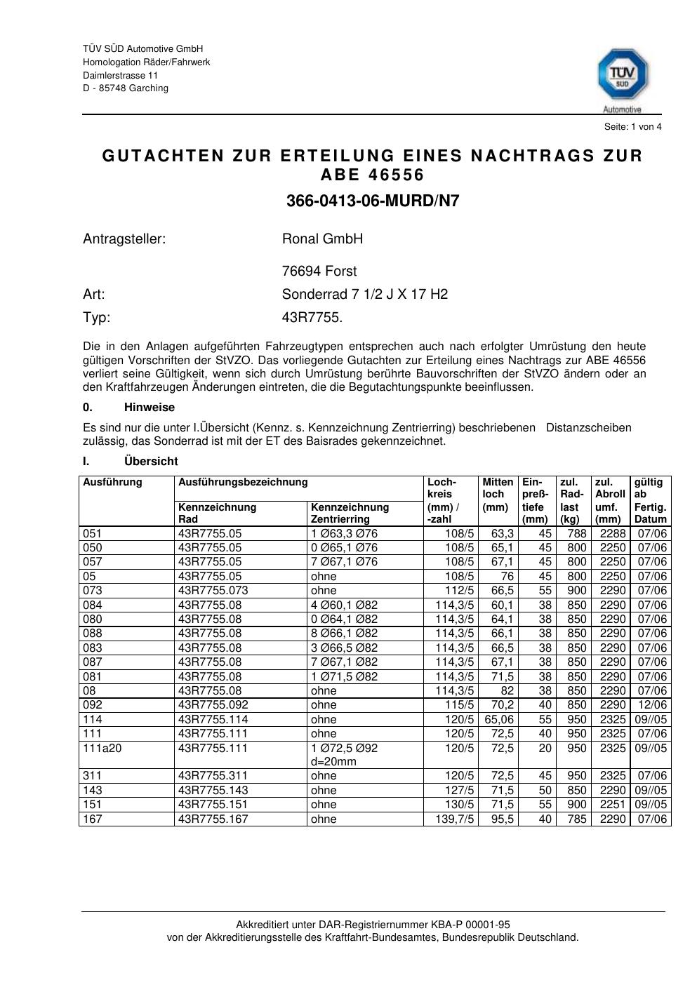 Dieses Gutachten (abe) bezieht sich auf die Alufelge ATS 43R7755 in der Ausführung 2Jx17 ET 0, Mittenloch 0 mm (KBA 46556). Im PDF findest du typischerweise zulässige Reifengrößen, Auflagen/Anbauhinweise und – je nach Dokument – Hinweise zur Eintragung.
