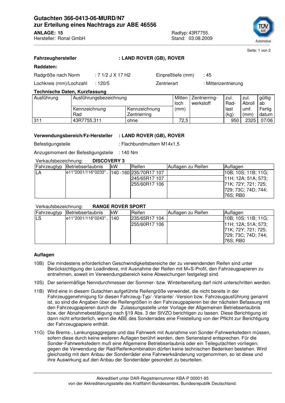Dieses Gutachten (abe) bezieht sich auf die Alufelge Ronal 43R7755 in der Ausführung 2Jx17 ET 0, Mittenloch 0 mm (KBA 46556). Im PDF findest du typischerweise zulässige Reifengrößen, Auflagen/Anbauhinweise und – je nach Dokument – Hinweise zur Eintragung.