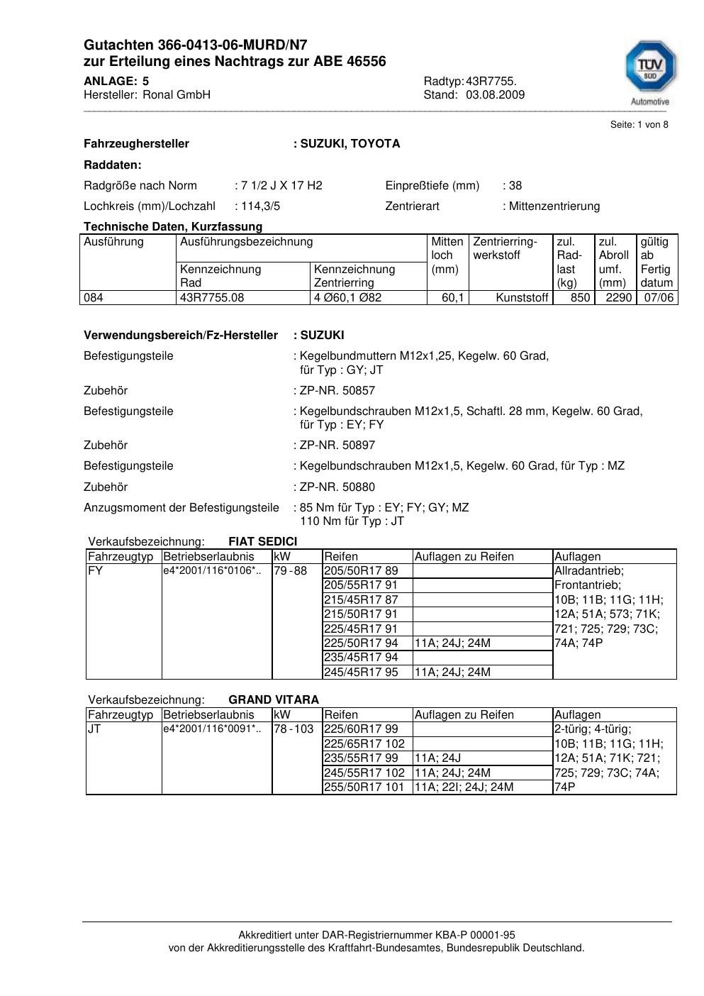 Dieses Gutachten (abe) bezieht sich auf die Alufelge Ronal 43R7755 in der Ausführung 2Jx17 ET 0, Mittenloch 0 mm (KBA 46556). Im PDF findest du typischerweise zulässige Reifengrößen, Auflagen/Anbauhinweise und – je nach Dokument – Hinweise zur Eintragung.