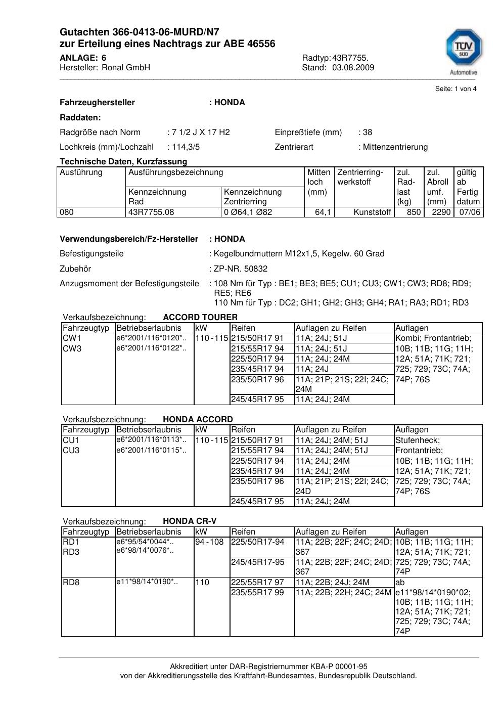 Dieses Gutachten (abe) bezieht sich auf die Alufelge Ronal 43R7755 in der Ausführung 2Jx17 ET 0, Mittenloch 0 mm (KBA 46556). Im PDF findest du typischerweise zulässige Reifengrößen, Auflagen/Anbauhinweise und – je nach Dokument – Hinweise zur Eintragung.