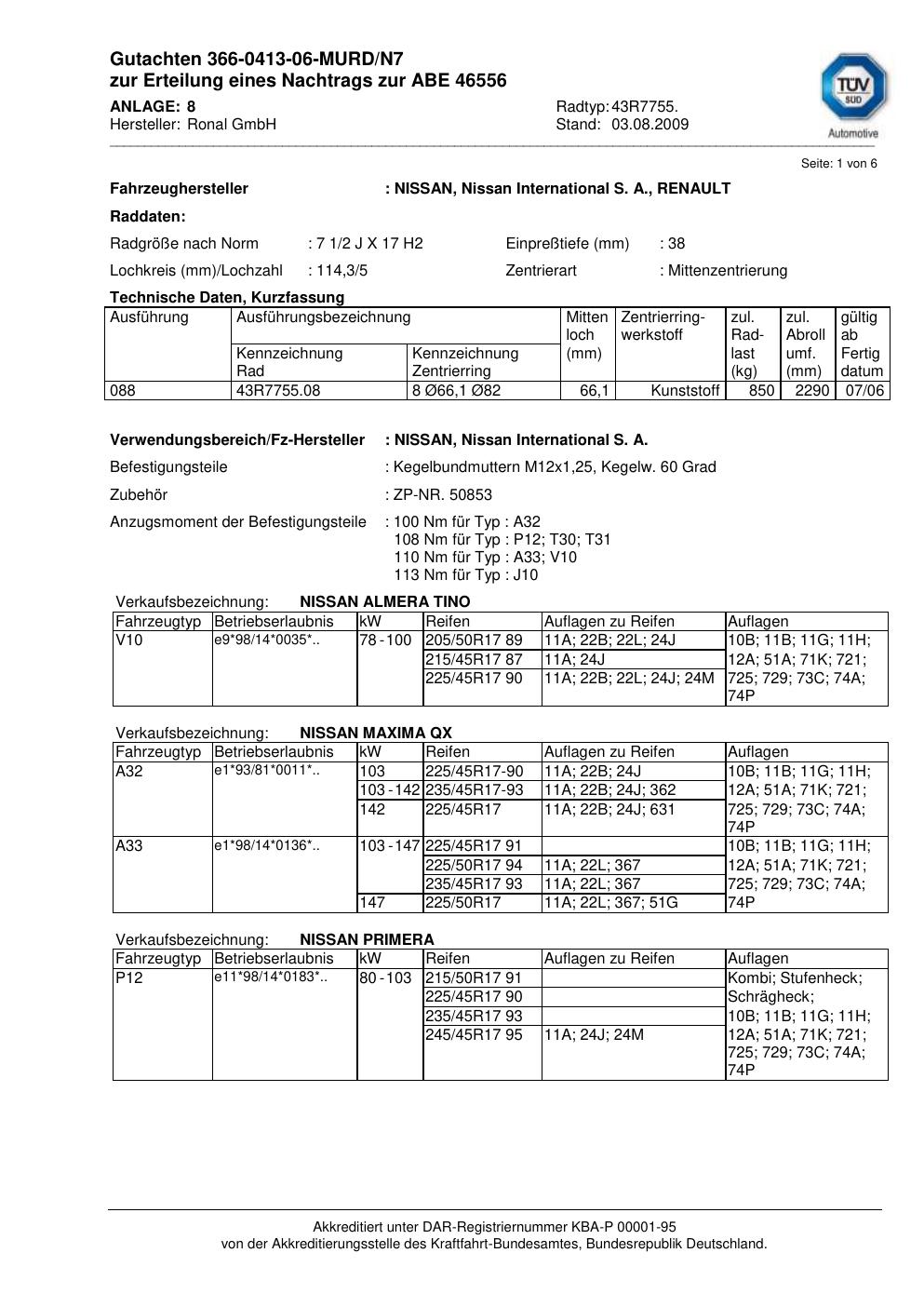 Dieses Gutachten (abe) bezieht sich auf die Alufelge Ronal 43R7755 in der Ausführung 2Jx17 ET 0, Mittenloch 0 mm (KBA 46556). Im PDF findest du typischerweise zulässige Reifengrößen, Auflagen/Anbauhinweise und – je nach Dokument – Hinweise zur Eintragung.